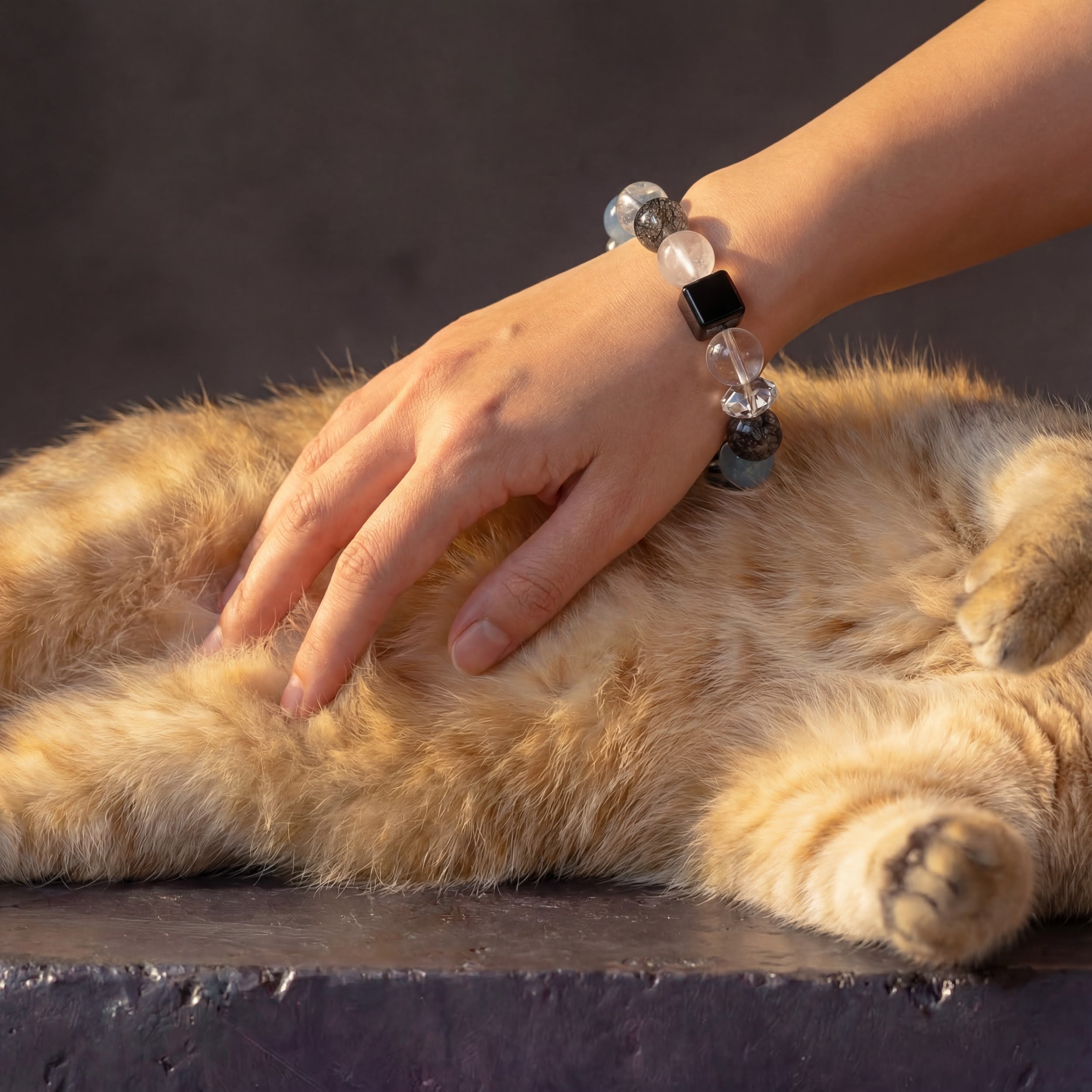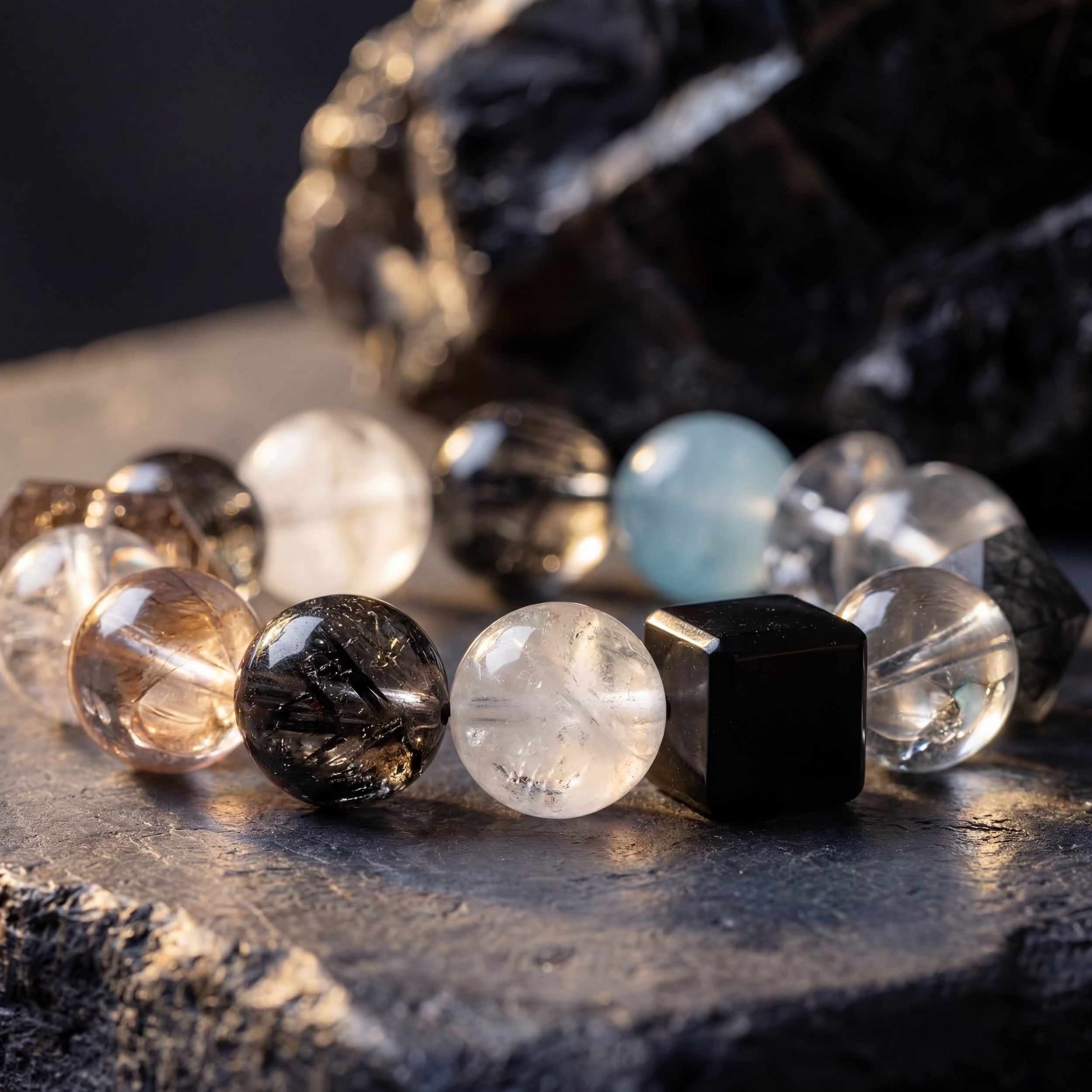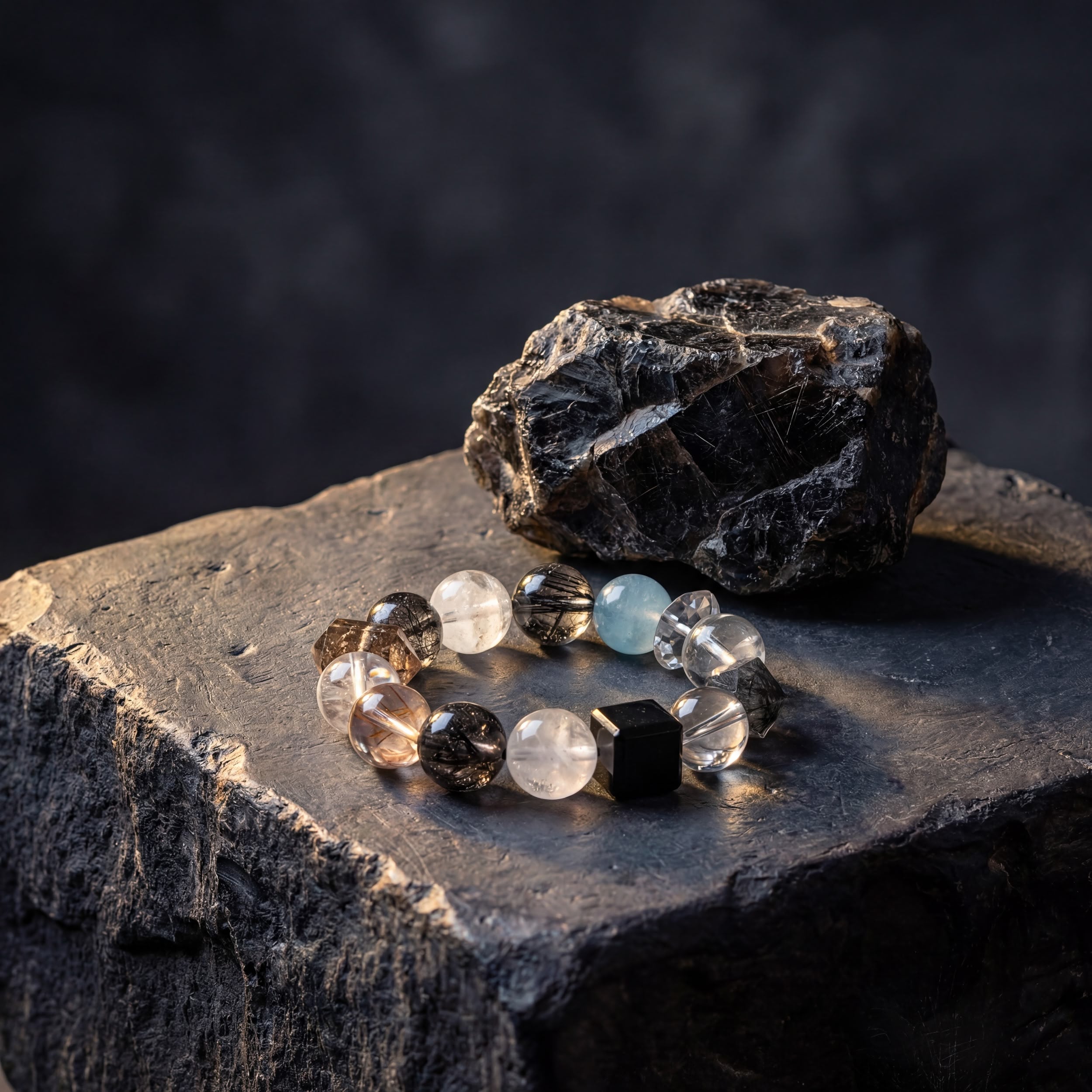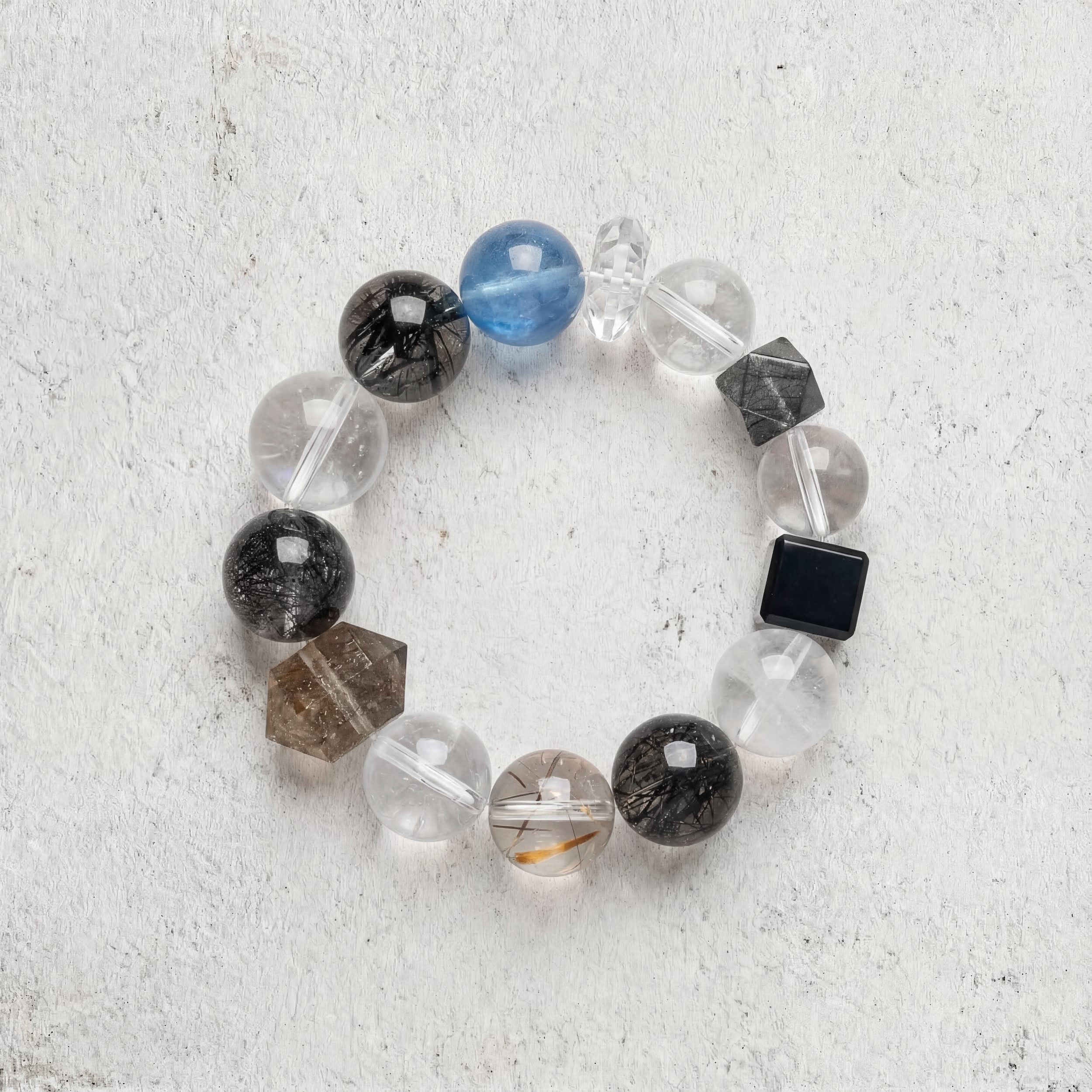 A substantial anchor for the self. This configuration is built to establish boundaries in high-friction environments. The dense network of Black Rutilated Quartz and Super Seven acts as a filtration system against psychic static and corporate noise. Interrupted by White Phantom Quartz to prevent energetic stagnation. Substantial, grounding, and unapologetically present.